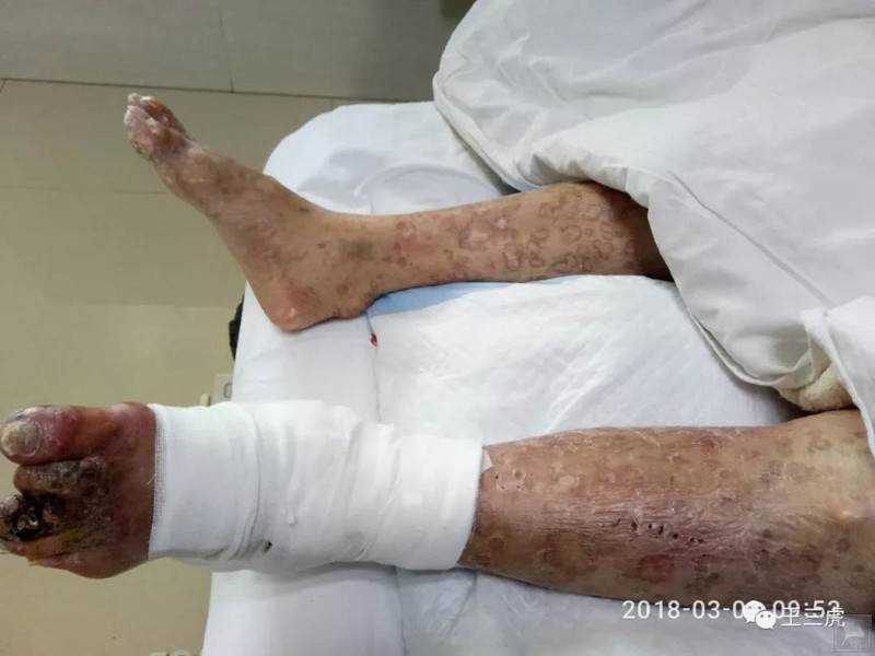 我依据双下肢红紫,舌红近绛,诚如仲景所谓“血证谛也”,乃回复:血热血瘀,湿热成毒,水牛角30克,生地黄60克,赤芍60克,丹皮20克,金银花30克,连翘30克,土茯苓30克,车前草15克,栀子20克,黄连15克,黄芩15克,黄柏12克,甘草20克,怀牛膝30克,薏仁30克,苍术12克。