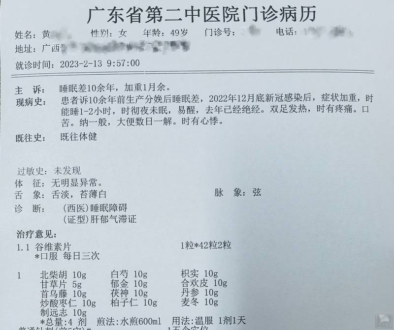 缘患者于10余年前生产分娩后,睡眠差,2022年12月底新冠感染后,睡眠差症状加重,夜间睡眠时1-2小时,时彻夜未眠,易醒,去年已经绝经,双足时有发热感,时有疼痛,口苦,纳一般,大便数日一解,时有心悸。余无特殊。舌淡,苔薄白,脉:弦。