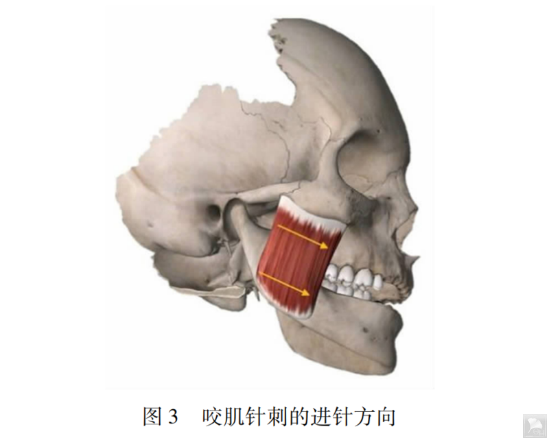 4.2.2 咬肌针刺在咬肌的动筋点垂直于肌纤维的走向进针(见图 3),动筋针(尺寸 0.30 mm x 40 mm或0.30 mm x50 mm),可选择水平松解,也可以垂直松解,配合带针运动。