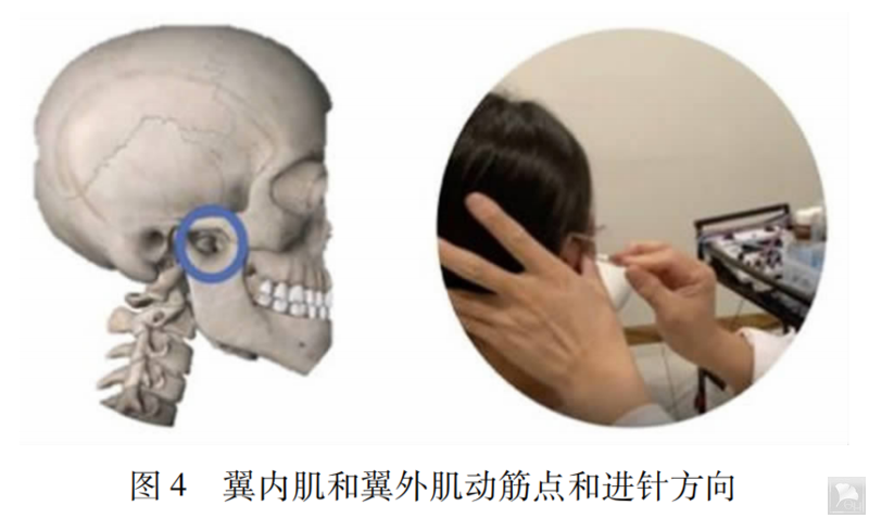 4.2.3 翼内肌和翼外肌针刺一般从颧弓下的颞下颌关节孔进针,动筋针尺寸选择0.30 mm x40 mm,动筋点和进针方向如图 4。因为这两块肌肉较为深在所以一般选择垂直松解,进行滞针提拉。