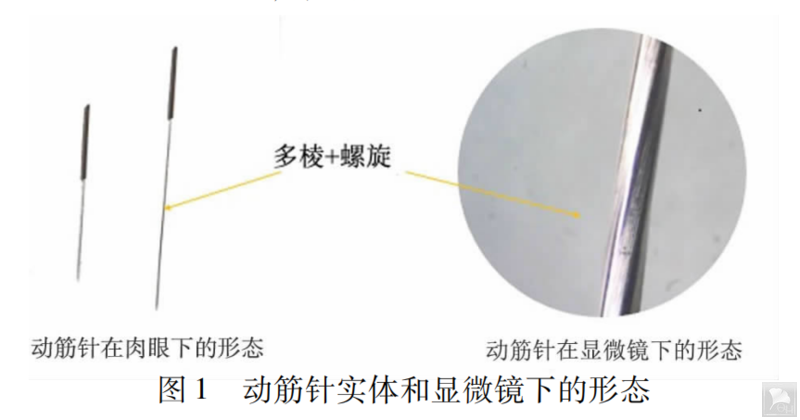 采用动筋针治疗。动筋针是由陈德成博士发明的一种专利针,针身的特点是具有5~6个棱和螺旋的结构(见图1)。根据颞肌和咬肌的解剖位置和肌肉走向,选择动筋针(0.30 mm x 40 mm 或0.30 mm x50 mm)平刺。