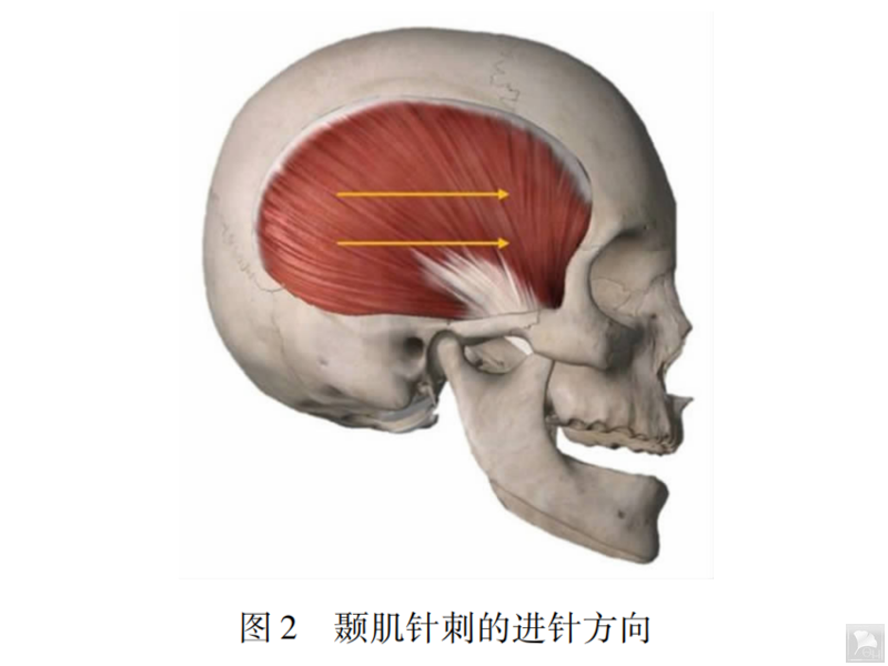4.2.1 颞肌针刺针体在动筋点位置垂直于肌纤维的走向进针( 见图 2),滞针提拉,即水平松解,配合带针运动。