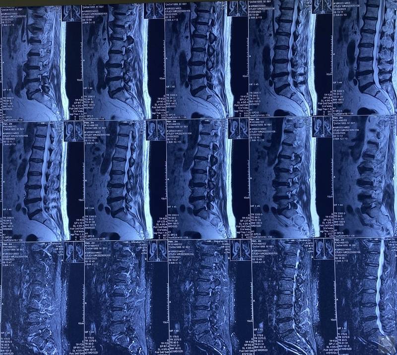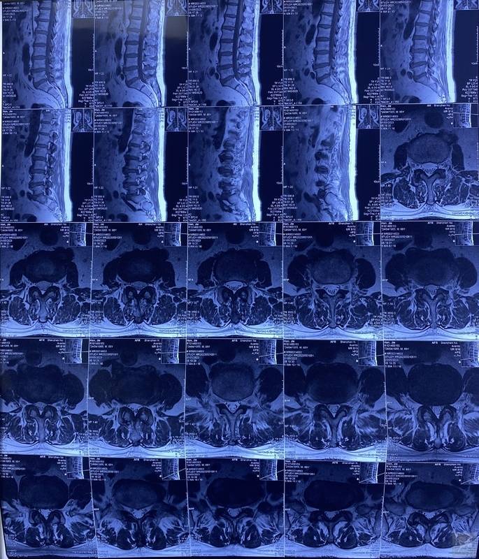 韩某,男,68岁,2023年6月27日首诊。患者主诉腰痛伴右下肢放射痛1月余。患者4年前体检时查出腰椎间盘突出,既往无腰痛等不适,2023-04-30出现腰部疼痛伴右下肢放射痛至小腿后外侧,腰部活动受限,次日查MRI示L3/4-L5/S1椎间盘不同程度膨出、突出,硬膜囊受压,神经根略受压。来诊时症见:腰部疼痛,俯仰、弯腰受限,不能久行,腰部不能伸直,臀部及右下肢放射疼痛、酸胀,四肢稍乏力,纳可,眠差,二便可,舌稍红,苔白腻,脉弦。既往有糖尿病史十余年,2023年4月发现右枕叶脑梗,现遗留四肢稍乏力。查体示腰L3-5脊柱及两侧按压痛,右侧直腿抬高试验(+),翻身困难。