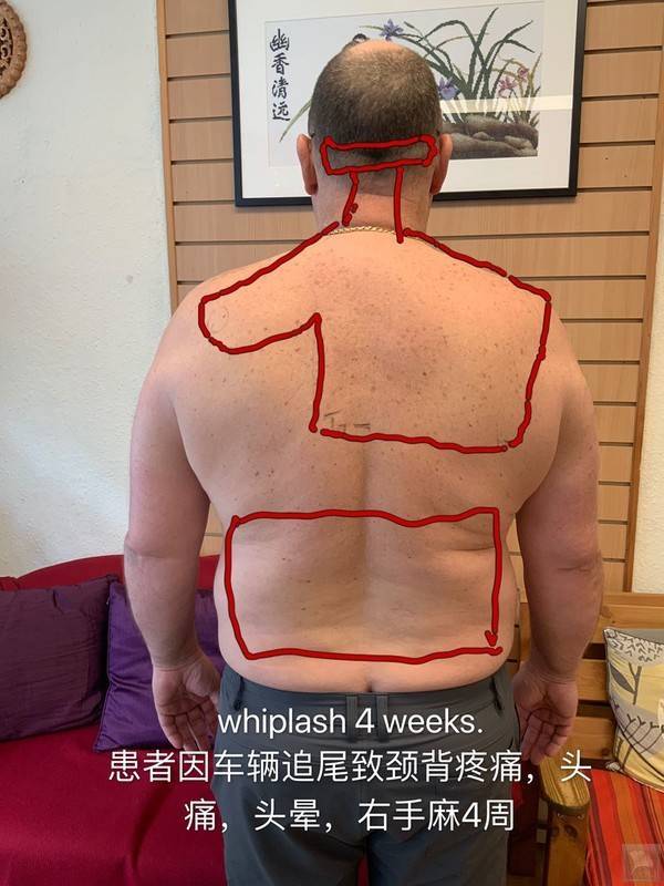 患者因车辆追尾致颈背疼痛,头痛,头晕,右手麻4周