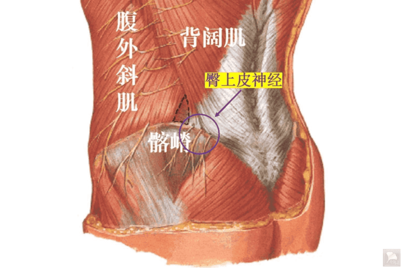 ①解剖:臀上皮神经为L1-L3脊神经后支的外侧支,穿出腰背筋膜后跨越髂嵴进入臀部,支配臀上部皮肤(见图1)。