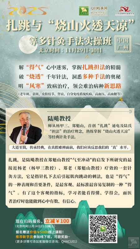如果您对针灸也感兴趣,或想让自身针灸水平更上一层楼,一定不要错过北京时间11月29日-30日,陆教授在中国广州举办的面授班【扎跳与“烧山火透天凉”等多针灸手法实操班】,在本次课程陆教授除了讲授“扎跳”和“烧山火透天凉”外,还会讲解多种经典复式针灸手法,同时还会为大家介绍各种难治病种的新思路,针药并用,定能让你收获满满!