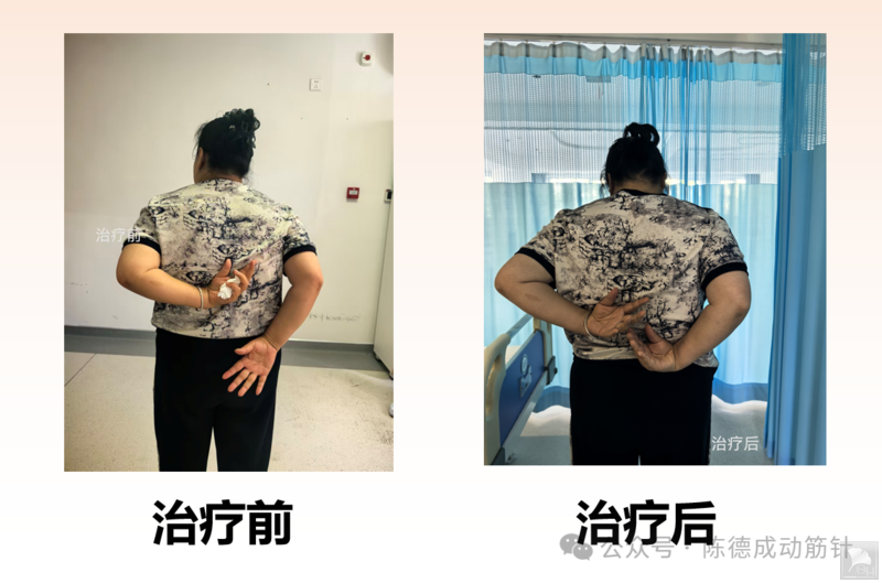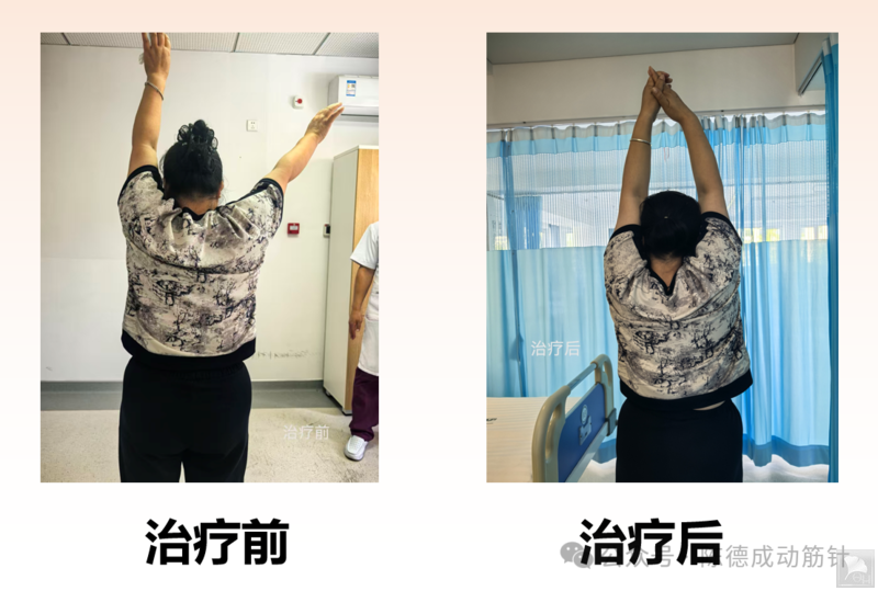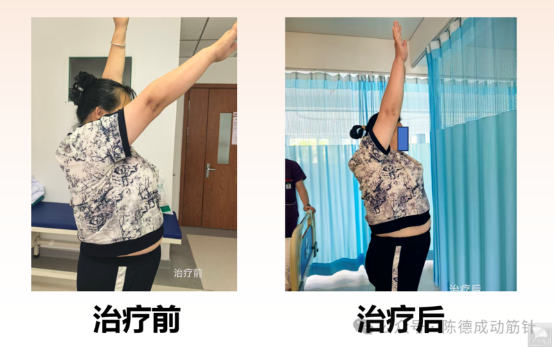 运用动筋针处理动筋点后,将动筋针留在合适的层次,嘱患者带针运动。一次治疗效果恢复正常活动,疼痛明显减轻。