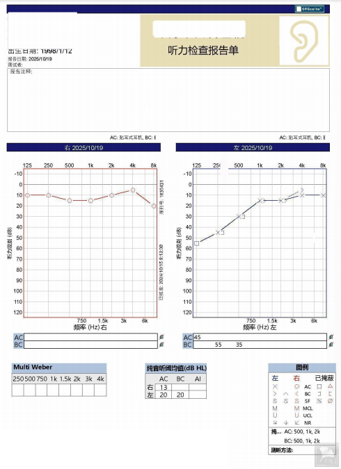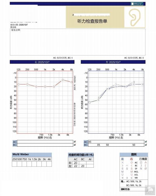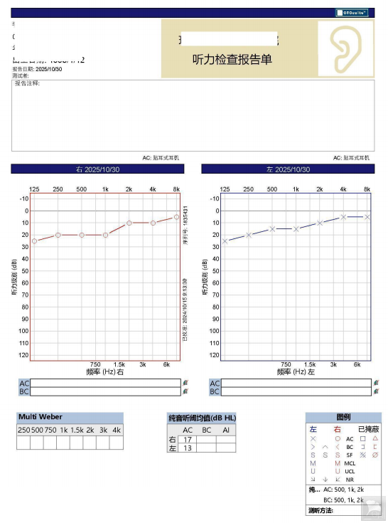 专科检查:电子耳内镜检查未见异常;听力检查报告如下: