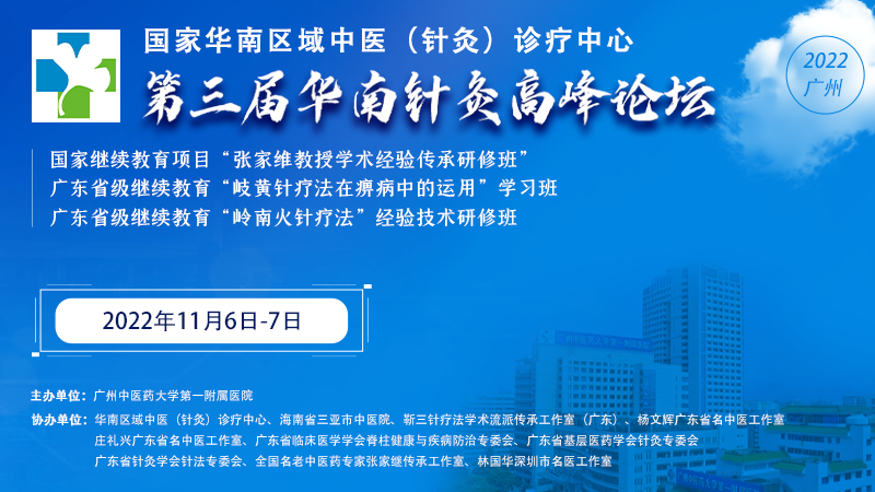 为进一步促进华南区域中医针灸专科学术与临床的交流和建设,加强华南区域针灸专科优势互补,促进区域内针灸学术流派之间的学术传承,带动和提高整个华南区域的针灸专科诊疗理论和技术水平,更好的传承名老中医学术思想,同时响应国家建设粤港澳大湾区建设的号召和要求,增进华南三省和粤港澳大湾区乃至国际中医针灸疗法的学术交流,拟2022年11月6-7日在广州中医药大学第一附属医院举行由广州中医药大学第一附属医院主办的国家华南区域中医(针灸)诊疗中心第三届华南针灸高峰论坛--2022,广州,和国家继续教育项目“张家维教授学术经验传承研修班”(编号:BT20221921028)广东省级继续教育项目“广东省非物质文化遗产‘岭南火针疗法’经验技术研修班”(编号:2022932101002 )以及广东省级继续教育项目“岐黄针疗法在痹病中的运用”学习班(编号:2022932101001)。会议邀请广东省中医药局党组书记徐庆锋局长、广州中医药大学国家973首席科学家许能贵教授、广州中医药大学第一附属医院李强书记、关彤副院长,以及国内20位中医针灸名家学者一起进行学术交流分享。本次会议大师汇集,讲座内容丰富,将给您带来一次丰富的学术盛宴,期待您的莅临参与。