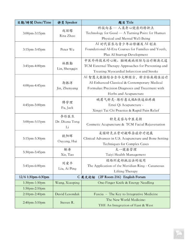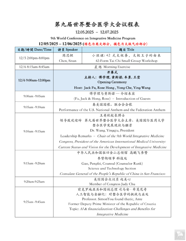 为保障参会者专业收获,大会设置差异化学分认证:为中国医学工作者及学生免费提供 6 个继续教育学分,为美国加州及全美中医针灸师提供 18 个专业学分。学术环节覆盖健康全领域,开设女性健康、男性健康、癌症康复、慢病整合调养、食药同源发展、AI 中医整合、针灸整合医疗(含跳针、迷你小刃针、小针刀等特色技术)、道医文化、中医不孕诊治、老人抗衰、抑郁症调理、太极运动处方标准、美容养颜、整合医学英文论坛等多元专题论坛,实现 “学术研讨 + 技术实操 + 产业对接” 全覆盖。