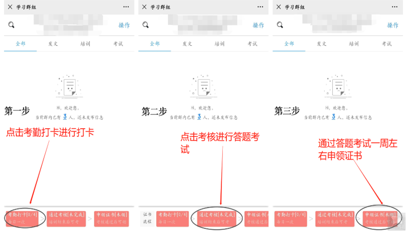 3、在学习群组里面根据页面显示打卡次数进行打卡→系统显示答题时间进行答题考试→会议结束后一周左右申领学分证书。