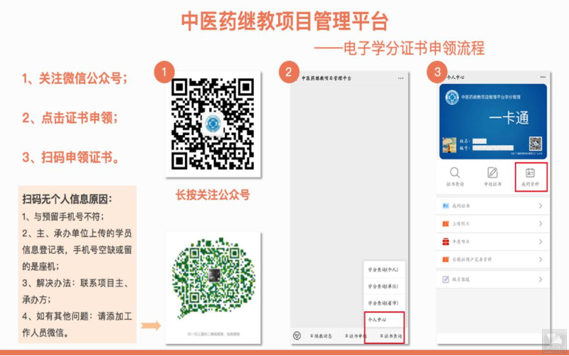 1、请扫描下图二维码→关注公众号“中医药继教项目管理平台”→右下角选择“证书查询”→选择“个人中心”→选择“我的资料”→如实填写个人信息后提交资料。