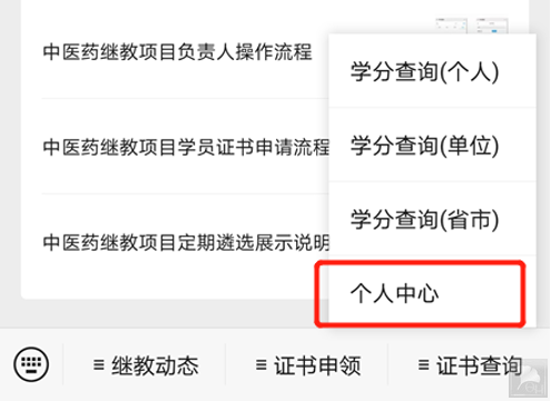 2)方式二:在学习群组申领学分证书后,再次登录“中医药继教项目管理平台”→→选择“证书申领”→→“个人中心”→→“证书查询”→→按要求输入相应的“学员姓名、身份证号”
