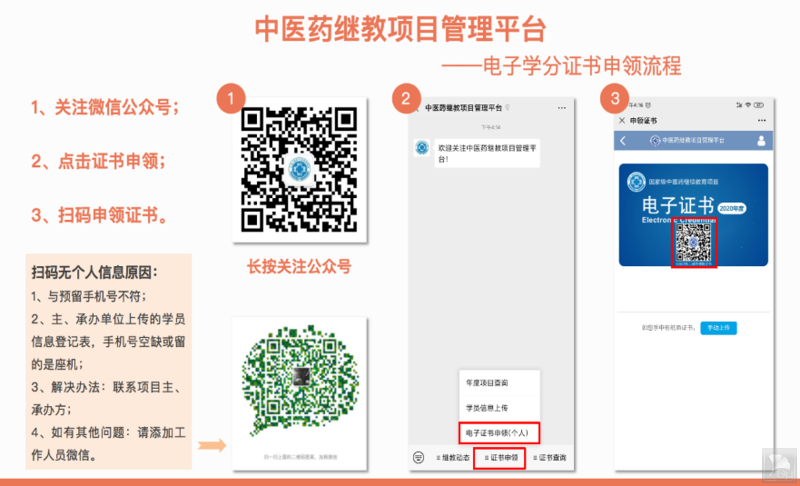 1)方式一:在学习群组申领学分证书后,再次登录“中医药继教项目管理平台”→→选择“证书申领”→→再选择“电子证书申领(个人)” →→长按识别二维码领取证书。