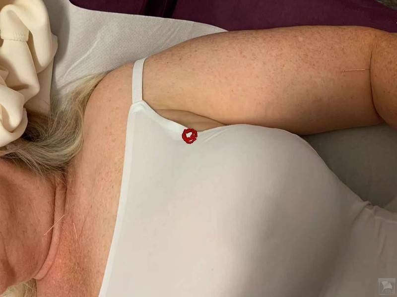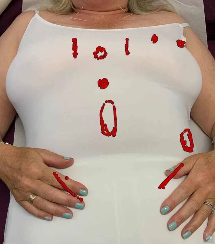 2 针对心脏问题,采用郄门穴浅刺制凉。患者述平时身体发热,针后感胸部发凉,但是头部仍然感觉热。于是➕刺印堂制凉。凉感逐渐由头下传至双脚。再去检查胸部