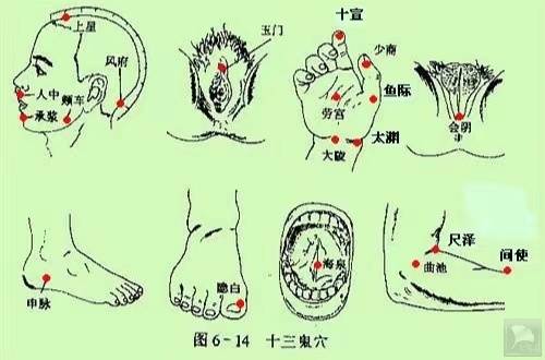今多指人中(鬼宫)、少商(鬼信)、隐白(鬼垒)、大陵(鬼心)、申脉(鬼路)、风府(鬼枕)、颊车(鬼床)、承浆(鬼市)、劳宫(鬼窟)、上星(鬼堂)、男会阴女玉门头(鬼藏)、曲池(鬼腿)、海泉(鬼封)等十三穴。