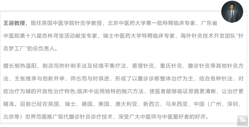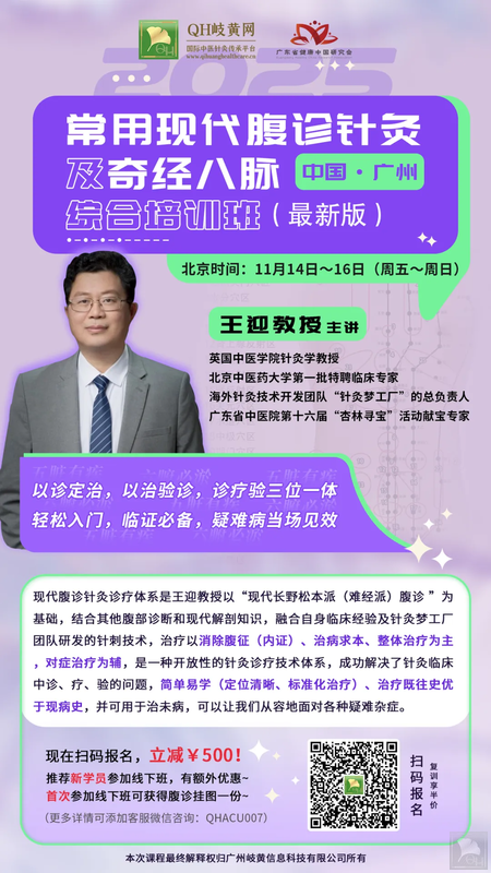 如果您跟随王迎老师学习“现代腹诊针灸诊疗体系”,欢迎报名王迎老师11月14日-16日在中国广州举办的面授班【常用现代腹诊针灸及奇经八脉综合培训班(最新版)】,现在享早鸟价优惠,点→【常用现代腹诊针灸及奇经八脉综合培训班(最新版)】了解更多课程详情