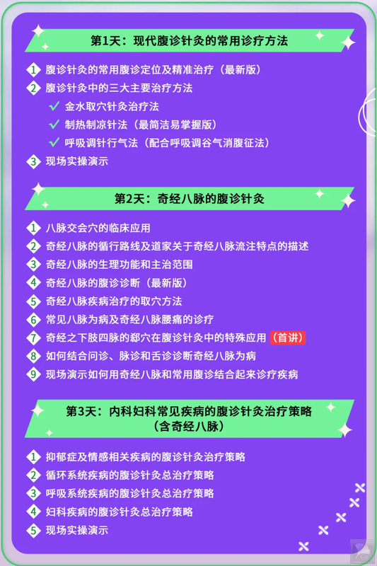 课程详情/报名入口:【QH直播】王迎教授:2025常用现代腹诊针灸及奇经八脉综合培训班(最新版)(中国·广州)