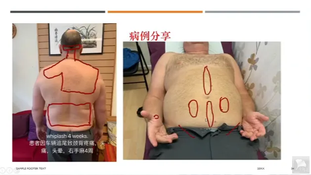 中的这位患者,因车辆追尾导致颈背疼痛,头痛,头晕,右手麻木4周,检査时如上图,背部一大片区域疼痛,还有头部淤血的问题。在腹诊查体时(上图右方),通过腹征,发现也是奇经八脉中任脉的问题,于是王迎教授选择双侧列缺、交信三针进行治疗,再去检查患处,疼痛几乎完全消失,不仅仅是腹征全消,而且后背的疼痛也完全消失,患者惊喜不已。