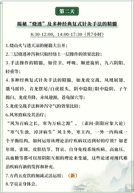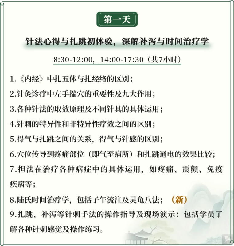北京时间5月16日-17日,陆飚教授将再次回国举办线下面授课程,全程亲授实战干货。既会介绍“扎跳”手法以及“烧山火透天凉”等针灸手法,还有各针刺手法的实战演示,同时,“风寒致病”的针药并用以及方药“五皮饮”的临床运用都涵盖其中,更有陆氏时间治疗学、子午流注、灵龟八法等传统针灸的高级课程讲解,理论与实操相结合,内容满满,全是干货!课程内容可参考下方图片: