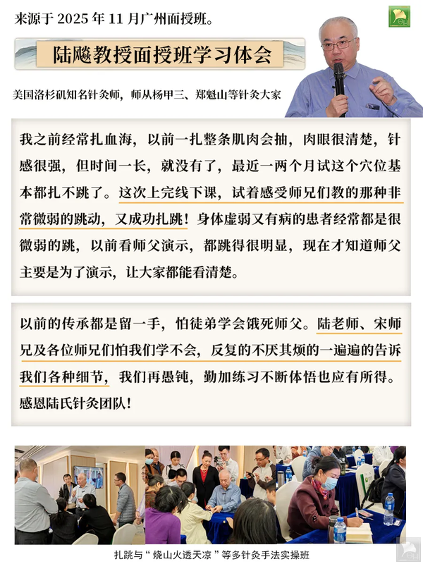 如果您第一次参加陆飚教授的学习也无需担心跟不上学习进度或思路,因为只要参加面授班学习的学员,都将赠送【陆氏针灸-22节视频】(价值:¥5000)助力夯实基础;线下面授班的学员还可获得同步直播录制的回放观看,课程结束后可反复观看回放视频、反复领悟。学员专属群更是终身有效,陆飚教授及其弟子或助教,还有其他学员们日常都会分享案例,第一时间供您学习讨论,期待您的加入!